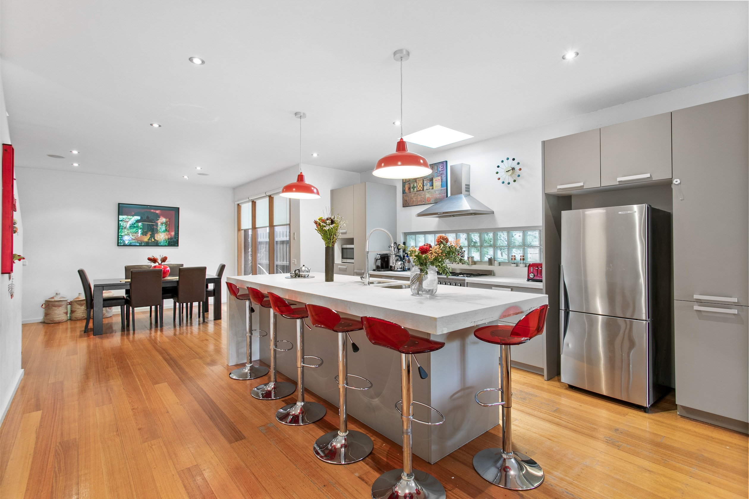 The modern kitchen is well equipped with quality SMEG stainless steel gas cooktop, electric fan forced oven plus a large island bench and abundance of storage.